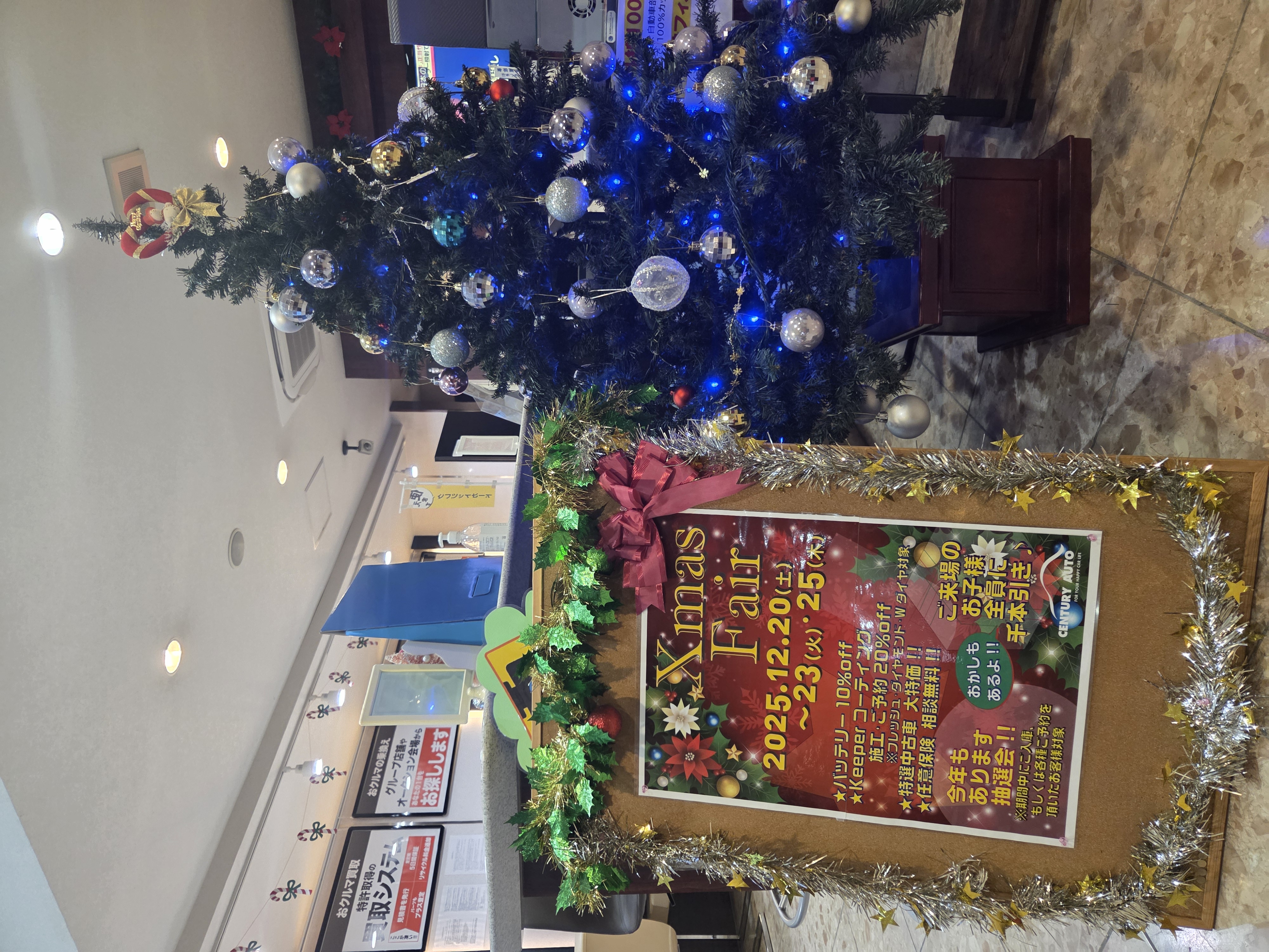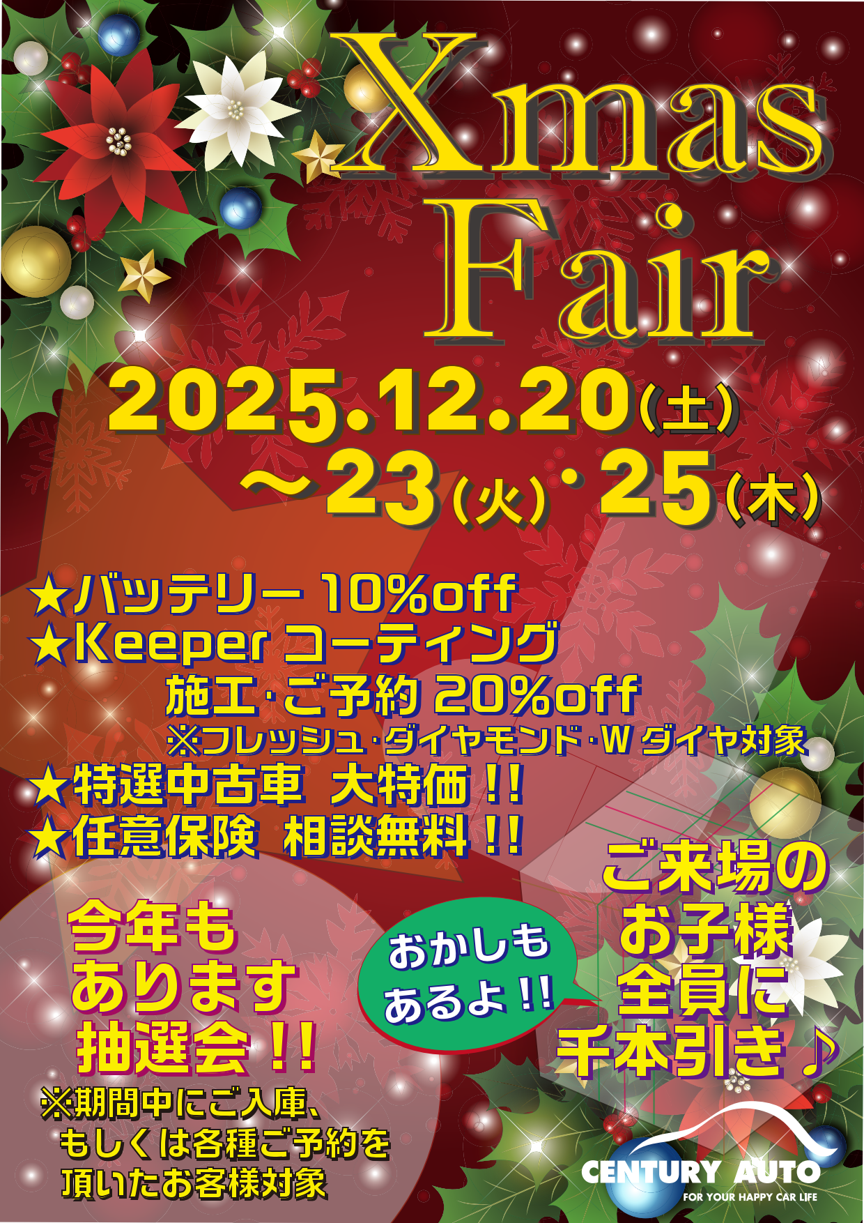 🎄2025年 Xmasフェア開催のお知らせ🎄 2025-12-09 冬晴れが心地よい師走の候、みなさまお変わりなくお過ごしでしょうか?さて、今年もやってまいりました、このシーズン♪来る12/20(土)~23(火)・25(木)、Xmasフェアが開催されます🎄この期間にご入庫、もしくは各種ご予約を頂いたお客様には抽選会も🎯✨その他、耳寄りな情報もございます😊お子様には全員、千本引きやお菓子をプレゼント🎁クリスマスは、センチュリーオートへ🚙