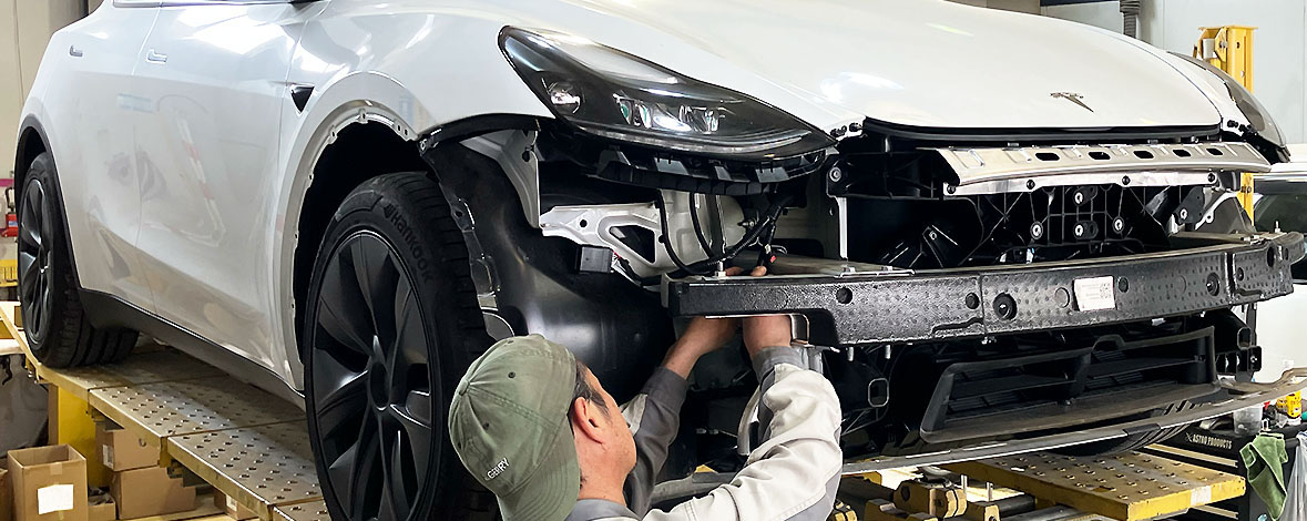 本社工場は2022年4月に千葉エリアで初となる【テスラ認定ボディショップ】となりました。続いて2025年9月に鎌ヶ谷事業所も認定を取得しました。米国の電気自動車(EV)メーカーとして知られる、テスラ(テスラ ジャパン)による厳しいトレーニングをすべて修了し、テスラ社が認める塗料、材料、専用設備を使用して、最高レベルの水準で作業を行います。